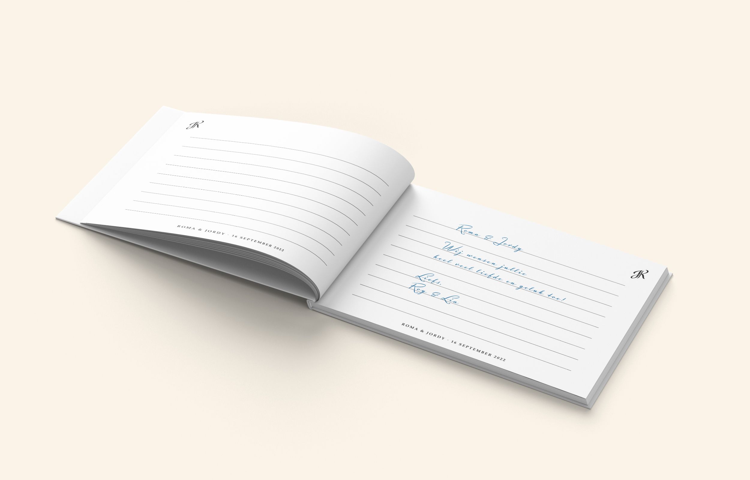 Voor deze bijzondere bruiloft heb ik het persoonlijke logo omgezet naar een digitale versie. Daarnaast had ik het voorrecht om ook de tafelkaartjes, menukaarten en het gastenboek vorm te geven en te realiseren. Alles werd tot in de kleinste details afgestemd op het thema en de sfeer van de dag. Het was prachtig om te zien hoe alles samenkwam tot één stijlvol geheel.